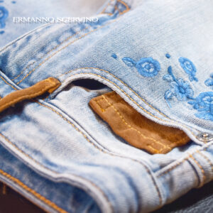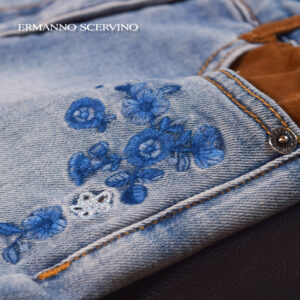 爽やかなライトブルーのウォッシュデニムに、フロントとバックへ施された繊細なフラワー刺繍が華やかなアクセント。