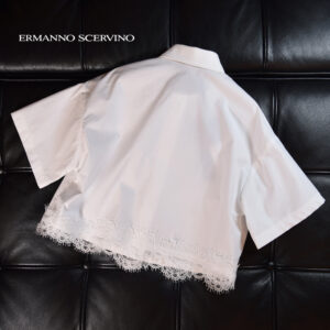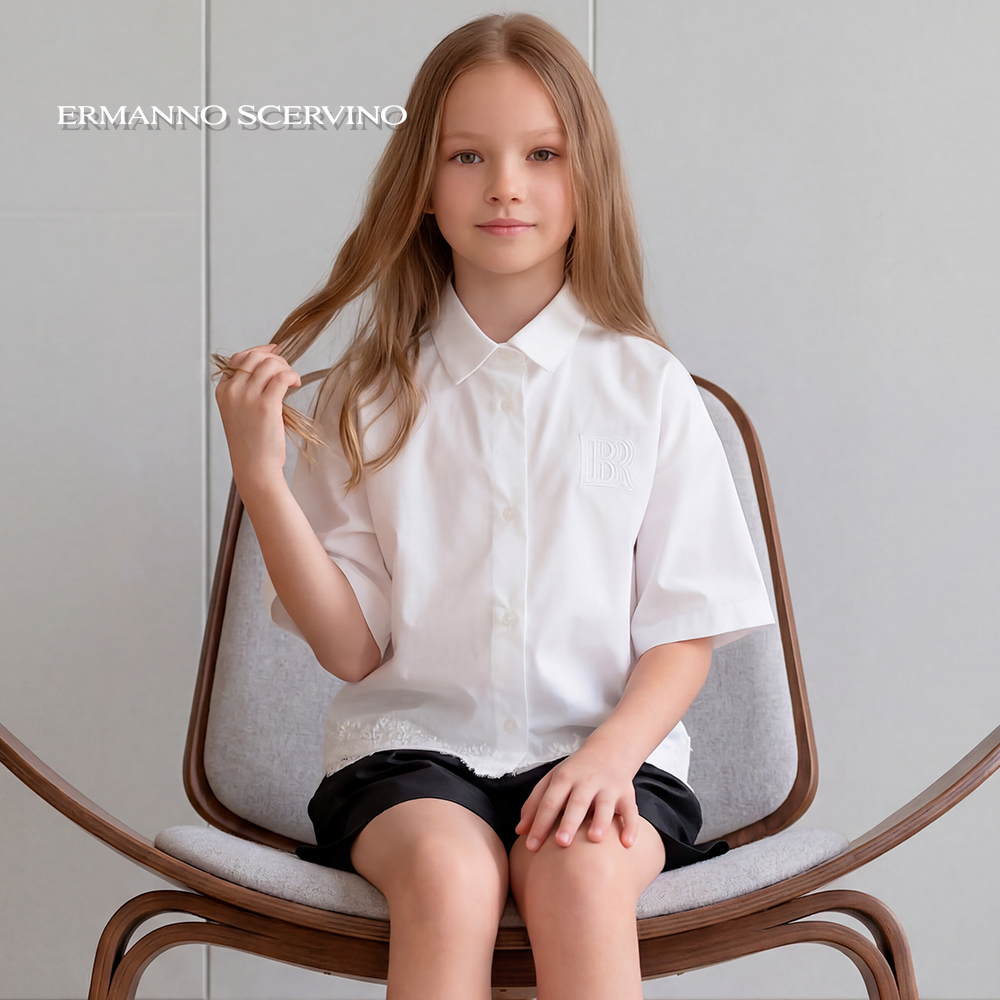 イタリアのラグジュアリーブランド ERMANNO SCERVINO(エルマンノ シェルヴィーノ) から、上品な存在感が魅力のキッズ半袖のホワイトブラウスです。清潔感のある白シャツをベースに、裾にあしらわれた繊細なレースデザインが華やかさを添え、シンプルながら洗練された印象に仕上げています。胸元のブランドロゴ刺繍がさりげないアクセントとなり、特別感のある一枚です。