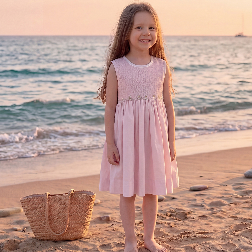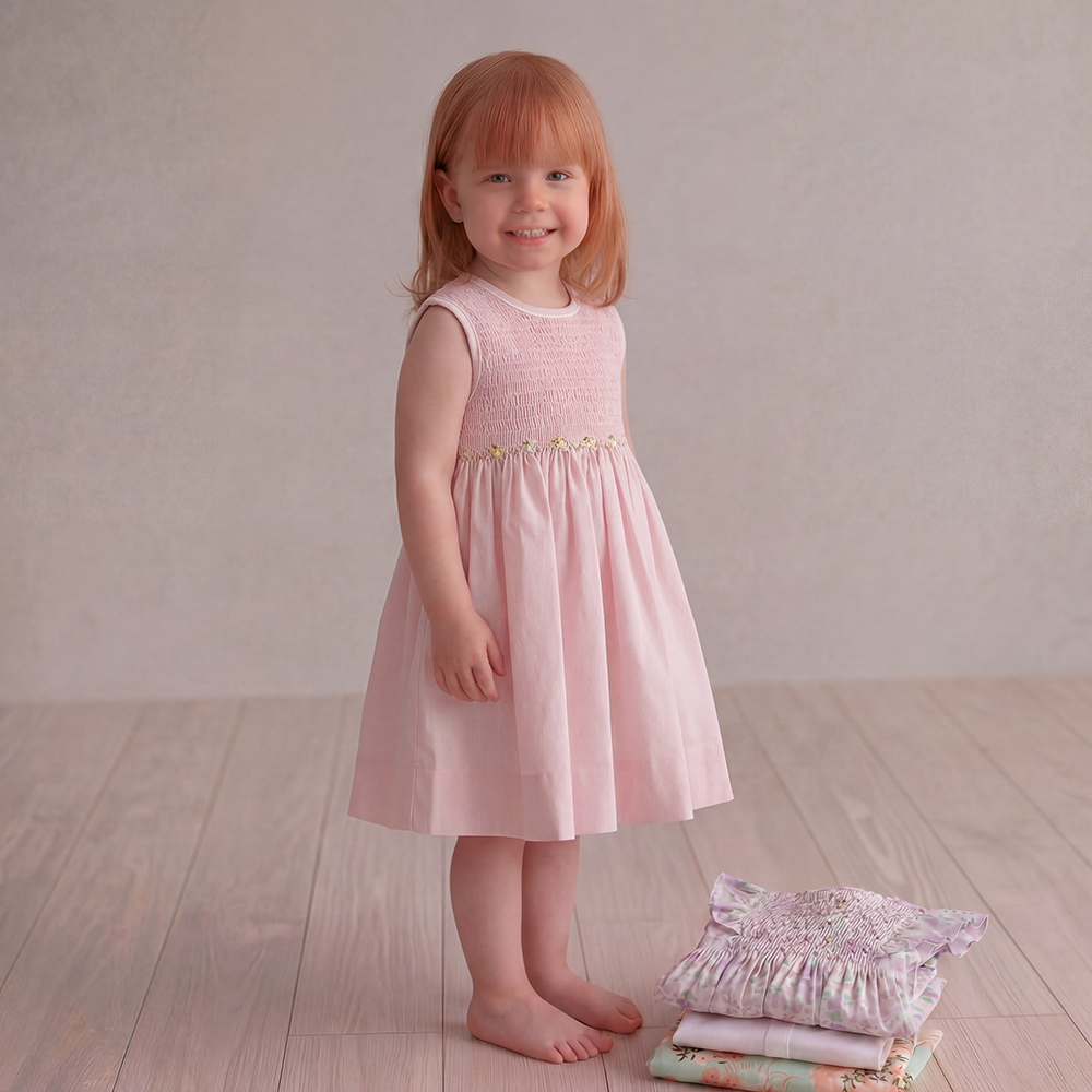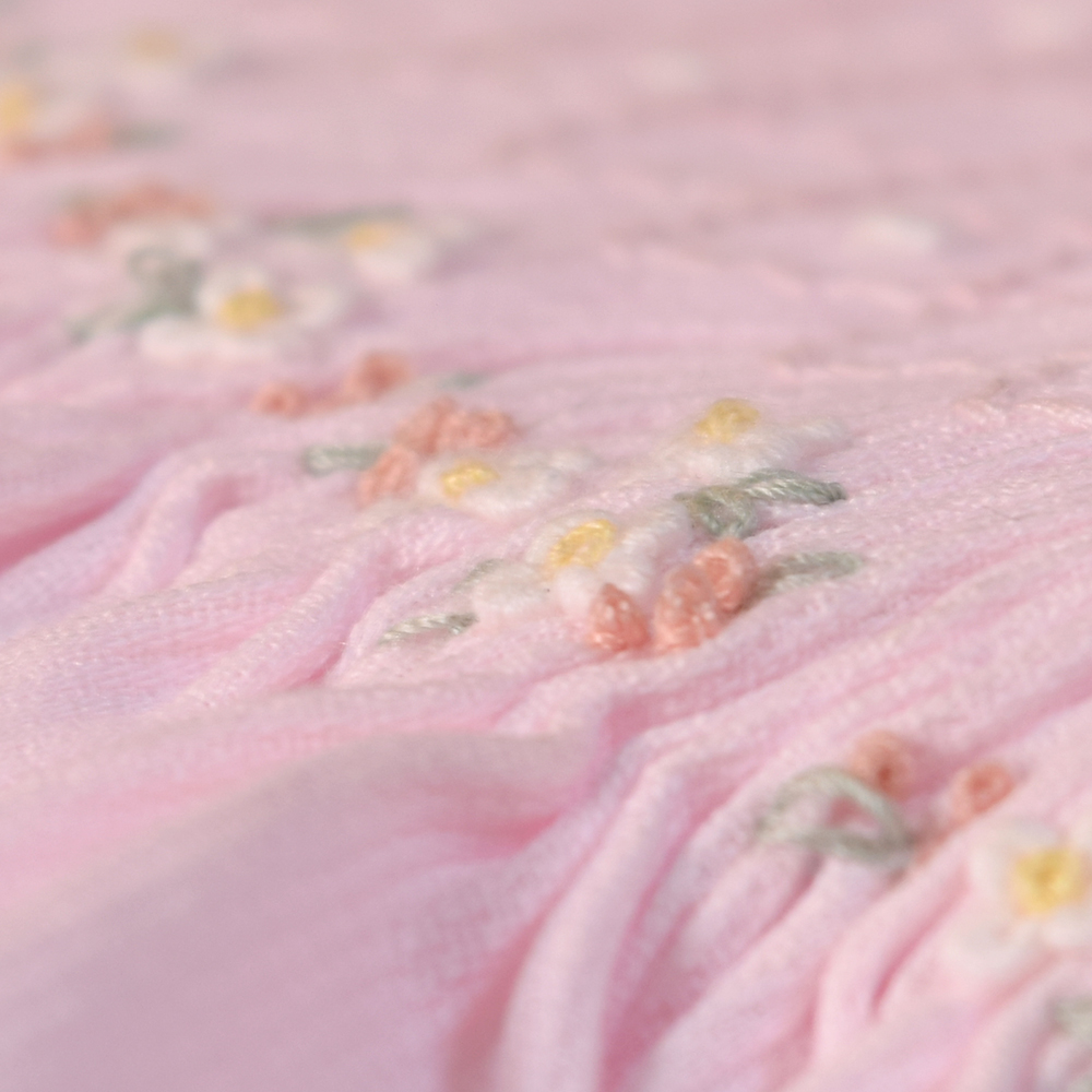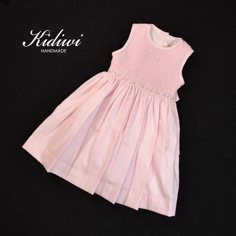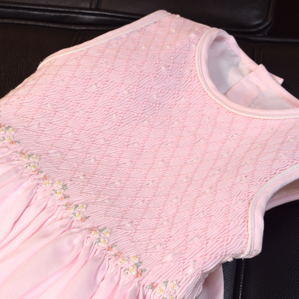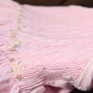 施されたスモッキング刺繍が広がります。繊細な刺繍のディテールは、