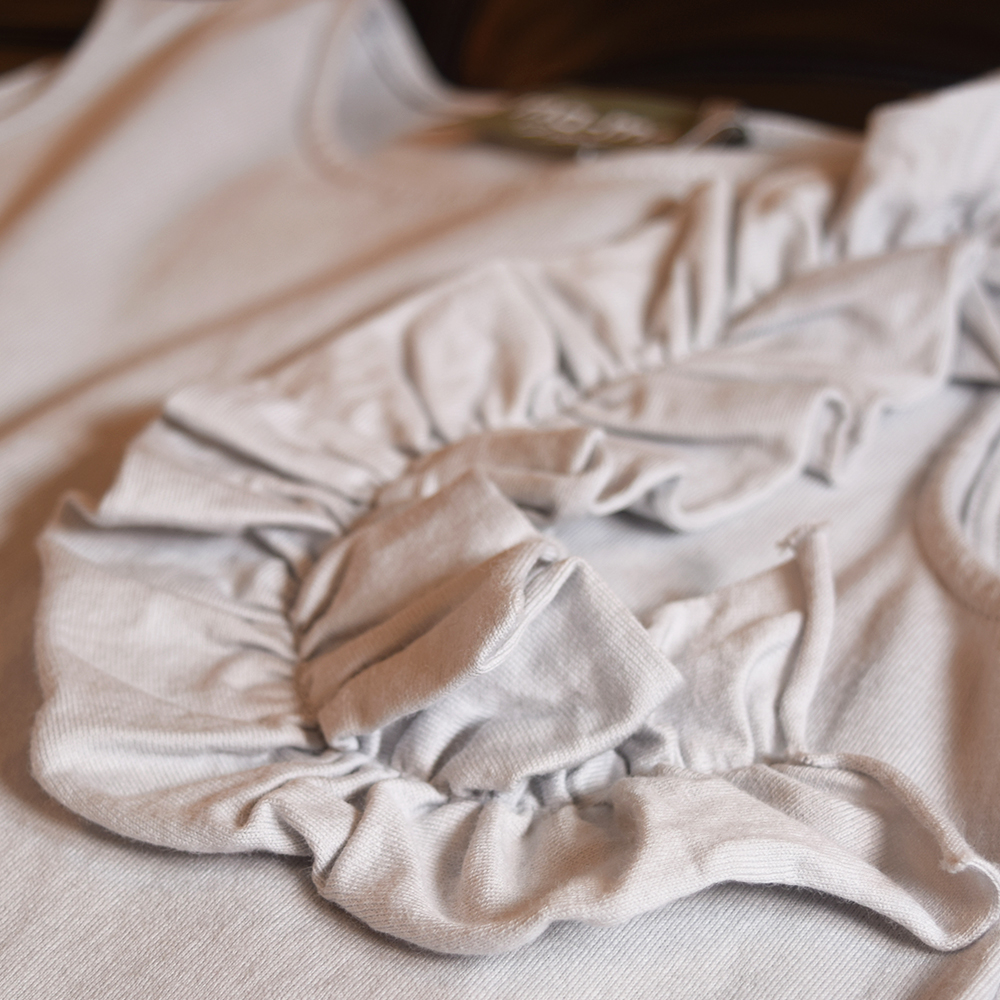 使用する素材は世界3大コットンの一つとされるGIZAコットンです。さらりとした肌触りの素材感で着心地も良く、シルクの様な光沢感が特徴で主にハイブランドのカットソーとして使われることが多いコットンです。