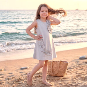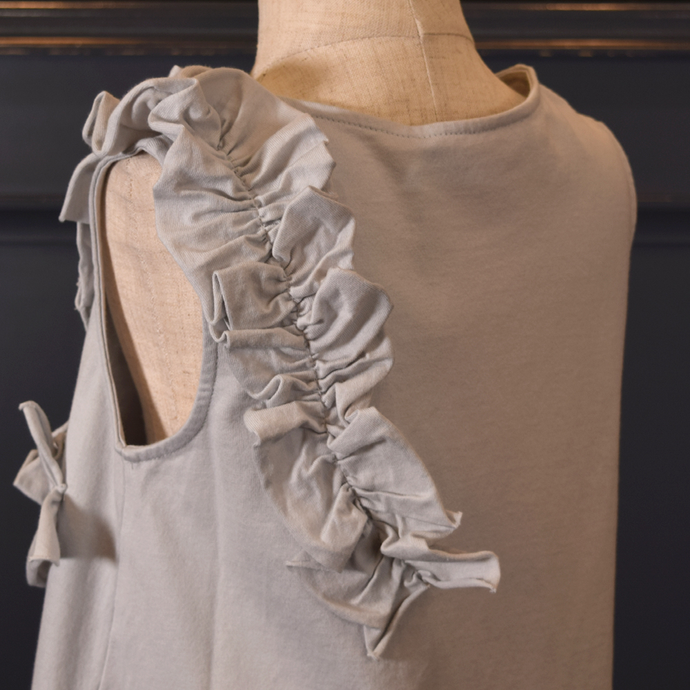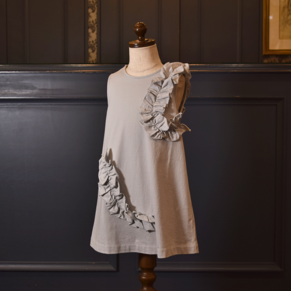 やわらかな海風に揺れる姿が印象的な、ナチュラルで上品なワンピースです。落ち着いたアイスグレーのカラーがシックな印象ながらも、これからの季節に軽快な印象を与えてくれます。フロント部分の2箇所にか施された立体的な同色共布のフリルが、シンプルなシルエットに華やかさ、立体感、可愛らしさをプラスしてくれます。