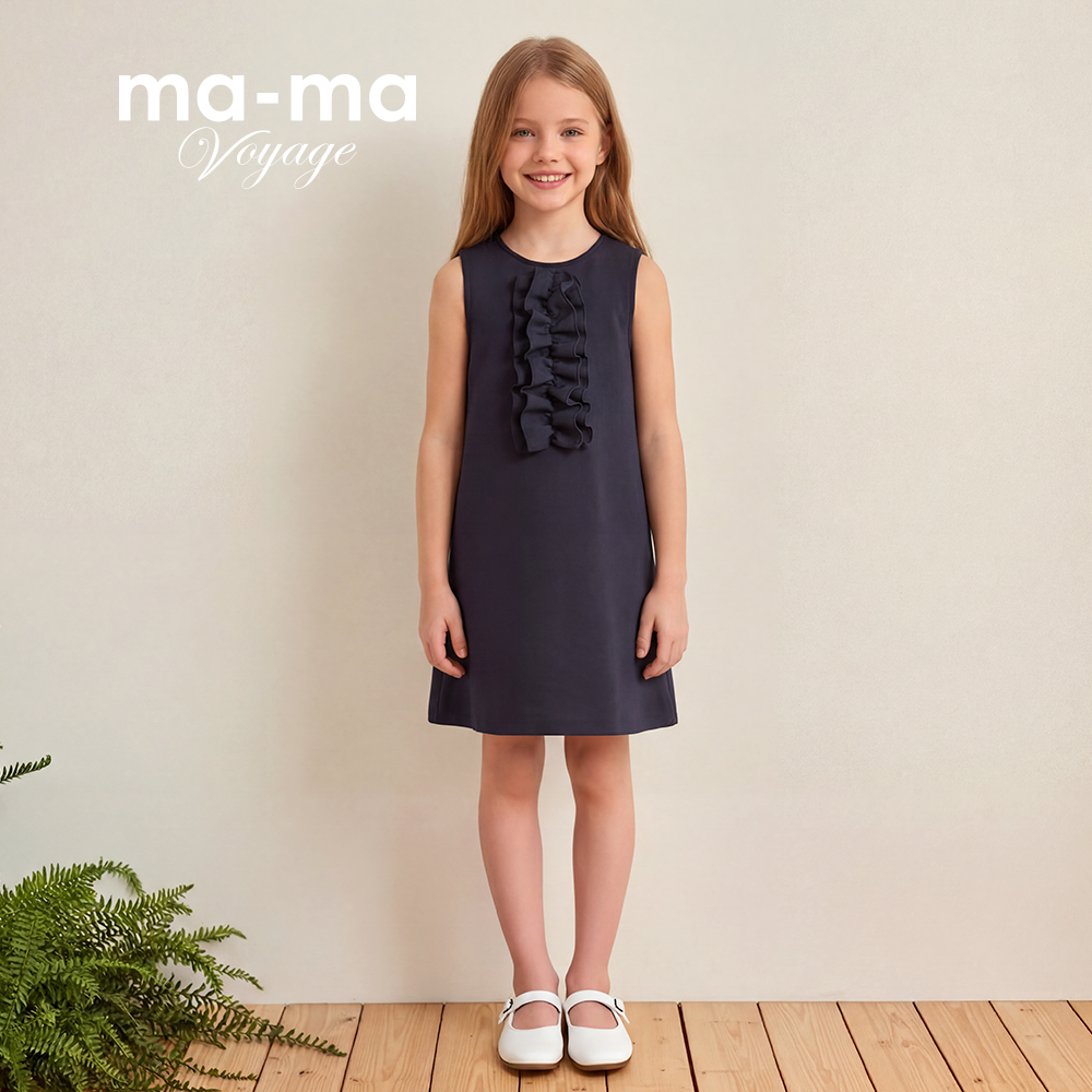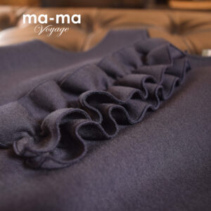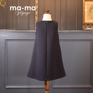 シルエットは程よくボリュームのあるAラインが特徴でして、フロント部分には二重のフリルを施して華やさをプラスしました。今回選択した素材は「ダンボールニット」でございます。聞きなれないかもしれませんが、見た目のきれいさと機能性を兼ね備えた人気素材で、シワになりにくくシルエットも型崩れしにくい為特に子ども服やきれいめアイテムによく使われます。 生地が表・中・裏の3層構造になっており、ダンボールのような空気層を含むため、適度な厚みとハリ感があり、オールシーズンお使いいただける便利な素材です。
