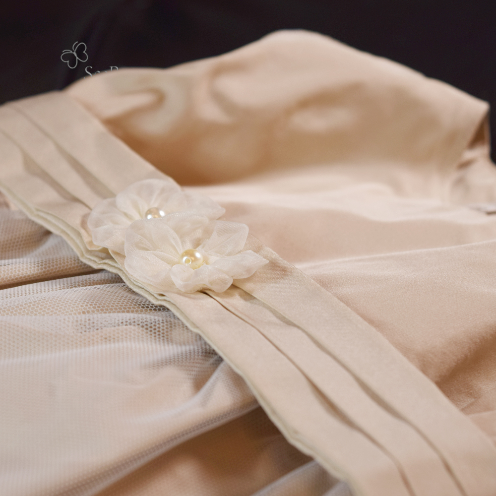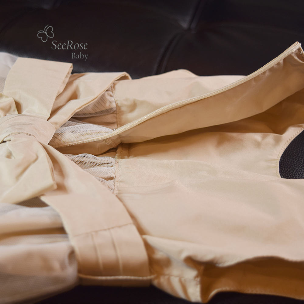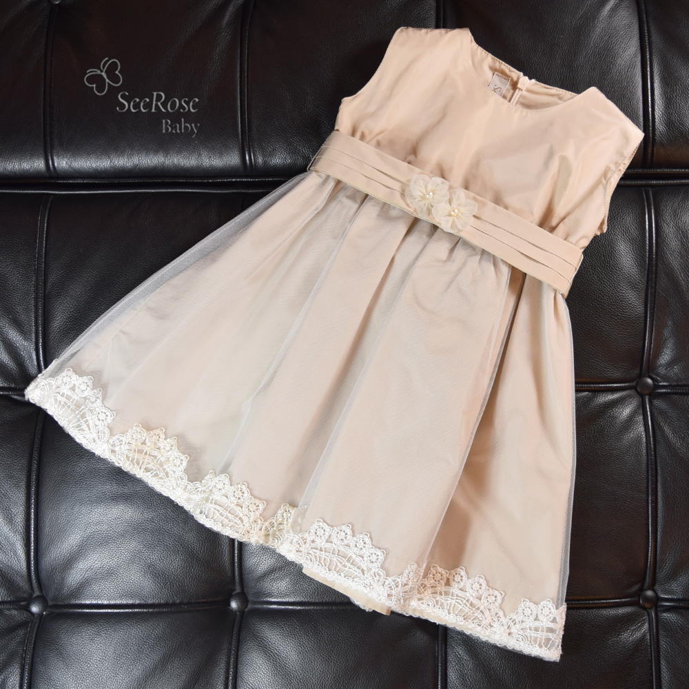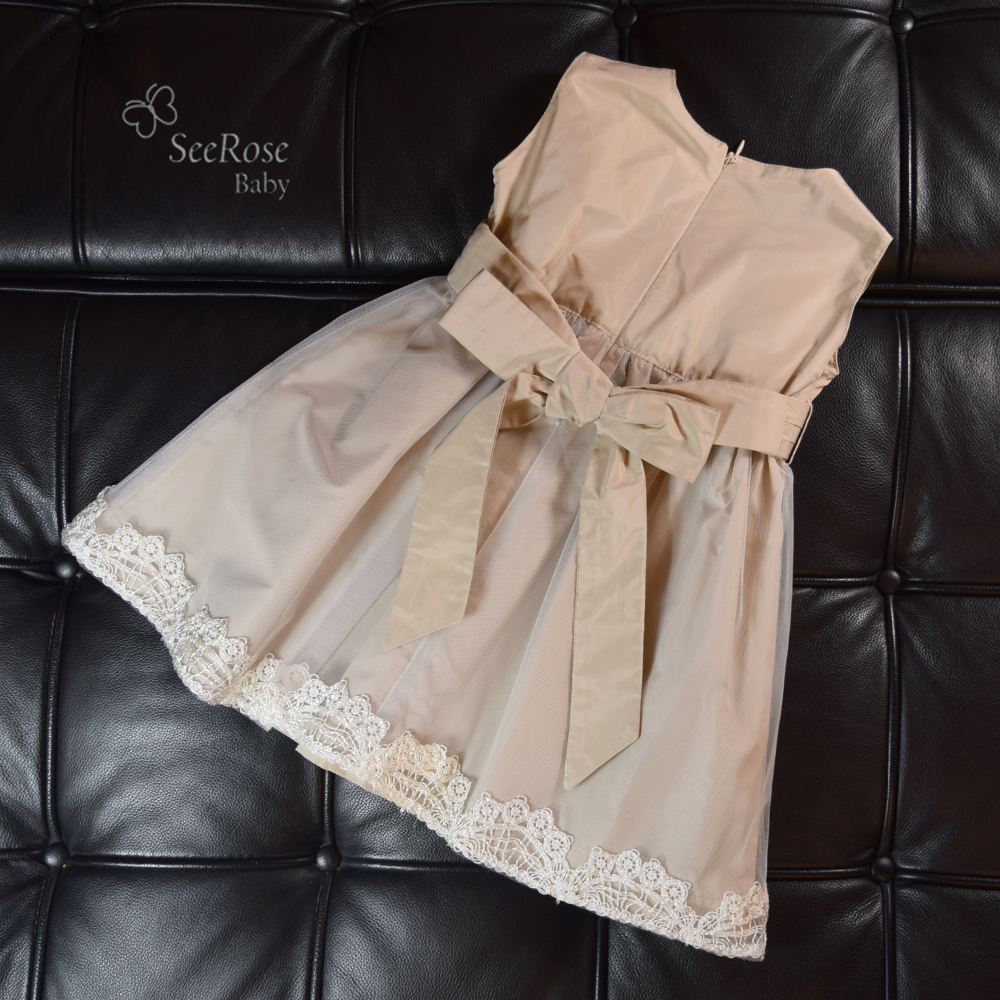 結婚式やお誕生日、発表会などの特別な一日にふさわしい、上品なレースが映えるやさしいベージュ(グレージュ)カラーのベビーフォーマルドレスです。