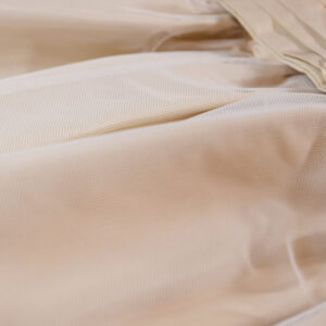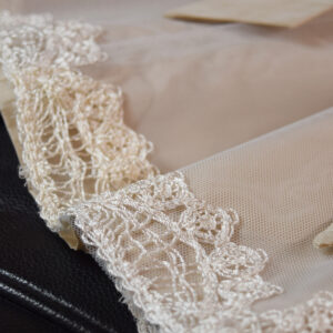 ふんわりと重なるチュールスカートに、裾にあしらった繊細なレースが上品な華やかさを添え、シンプルながらも印象に残る一着に仕上げました。