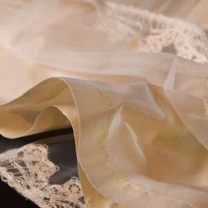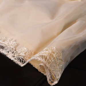 裾にあしらわれた繊細なレースが、細部までこだわり抜かれた高級感を引き立てます。