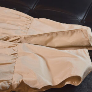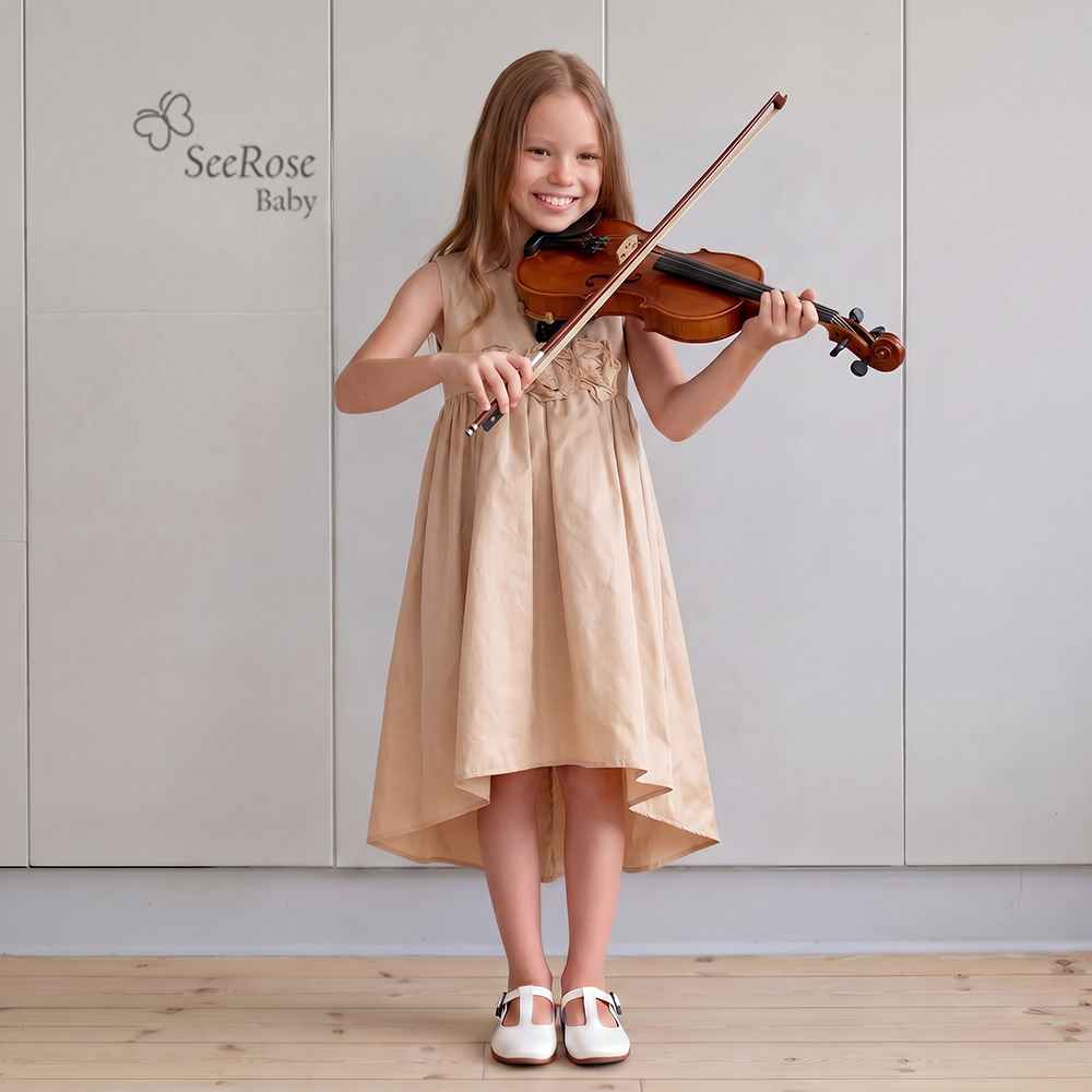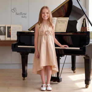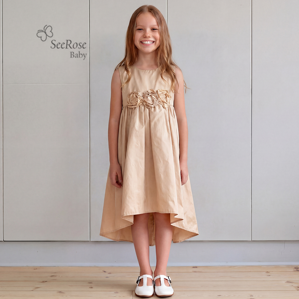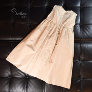 やわらかなシャンパンベージュの美しい光沢感と、胸元に咲く立体的なフラワーモチーフが、お子さまの可憐な魅力をより一層引き立てます。