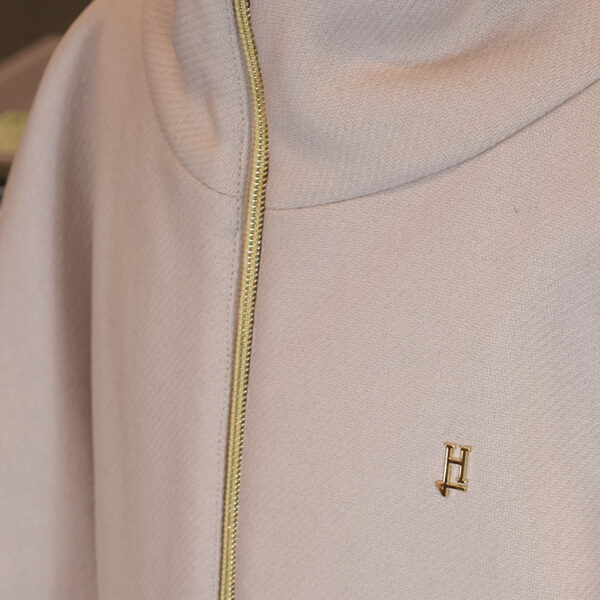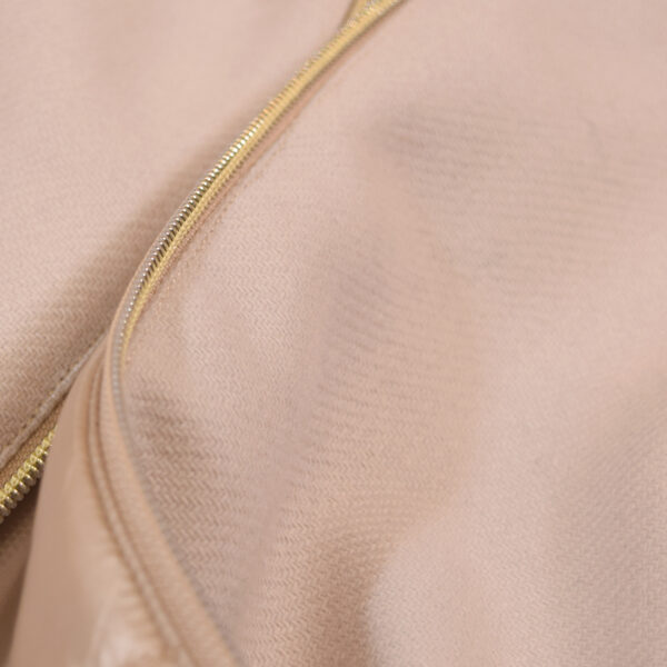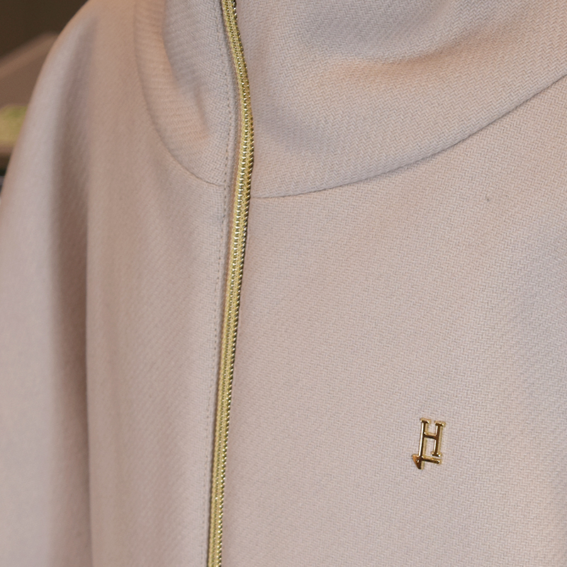 スッキリとしたノーカラーがは首周りをキレイに見せてくれ、また合わせるお洋服のデザインを壊す事なく 綺麗なシルエットに見せてくれます。反面シンプル過ぎてしまう…という事もあったりするのですが(汗) こと、こちらのモデルに関しては袖部分のナイロン素材が “ベタっ”としがちな全体の印象にアクセントになりますので 同色のハイライトが付きメリハリ感もあって◎です。